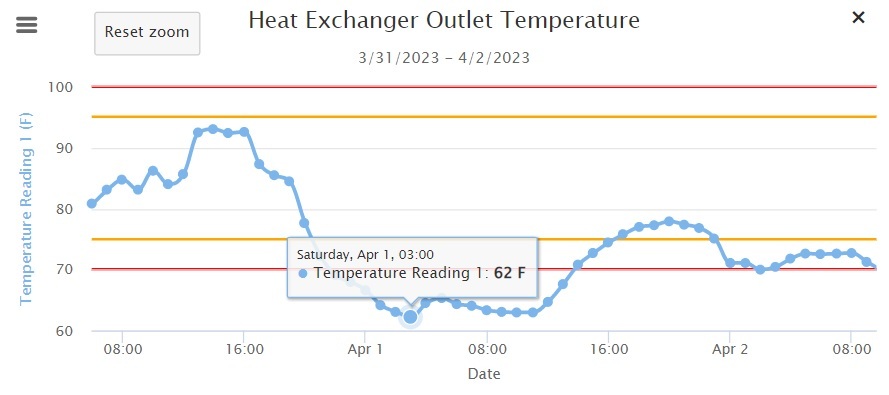 In 2023, this Midwest manufacturer installed the TankScan TSG cellular to 4-20mA sensor gateway at their Midwest location to monitor their critical heat exchangers. The monitoring system leverages cellular wireless technology, battery power, magnetically connected temperature sensors, ¼” NPT pressure sensors, and a cloud software application for the complete solution. The measurements are viewed from a PC at an office, or from any PC, laptop, or smartphone connected to the internet. The system is designed for temperature, pressure, vibration, and level monitoring. The user is provided with accurate readings to the visual devices they already own, understand, and support. The image below shows the telling sign of the stuck temperature control valve, allowing a 35° F swing in supplied cooling water temperature.